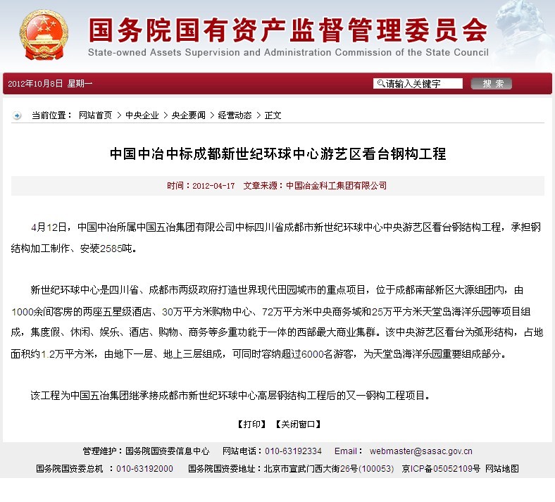 國資委網站報道:中國五冶集團中標成都新世紀環球中心游藝區看臺鋼構工程