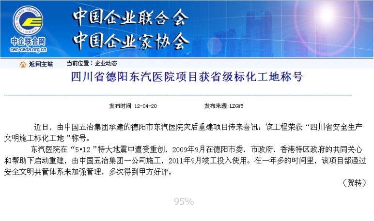 中國企業聯合網報道:四川省德陽東汽醫院項目獲省級標化工地稱號
