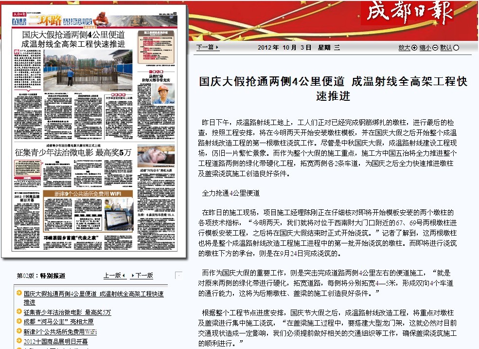 成都日?qǐng)?bào)報(bào)道:國(guó)慶大假搶通兩側(cè)4公里便道 成溫射線全高架工程快速推進(jìn)