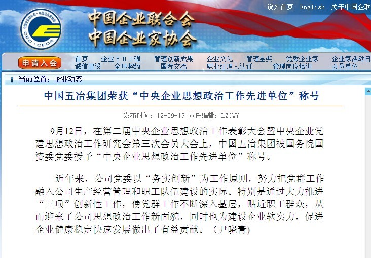 中國企業聯合網報道:中國五冶集團榮獲“中央企業思想政治工作先進單位”稱號