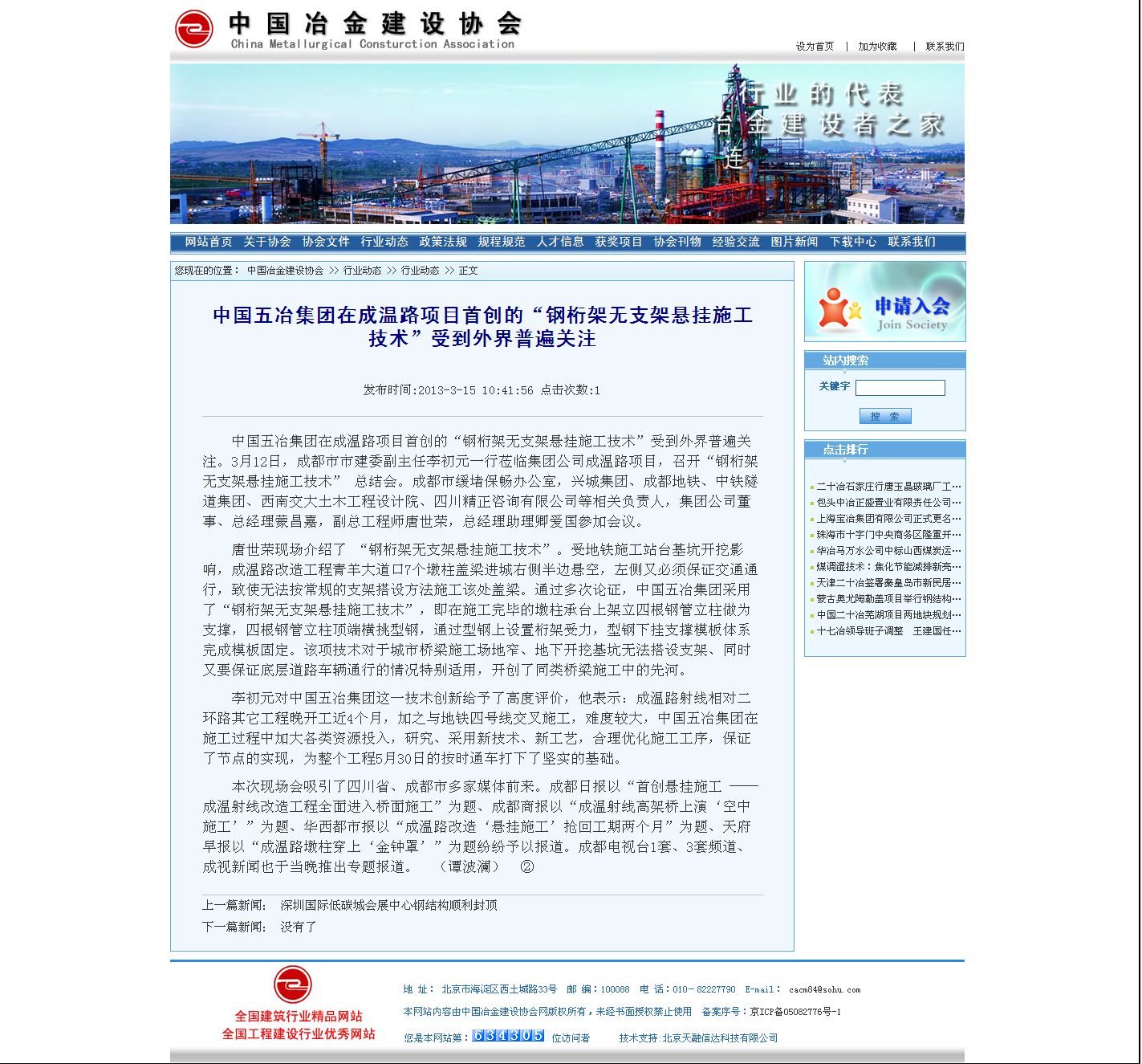 中國冶金建設協會網報道:中國五冶集團在成溫路項目首創的“鋼桁架無支架懸掛...