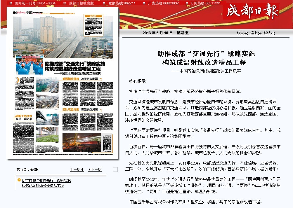 “兩環兩射兩快”項目,則是我市實施“交通先行”戰略的重要組成內容。其中,成溫射線改造工程由中國五冶集團承建。