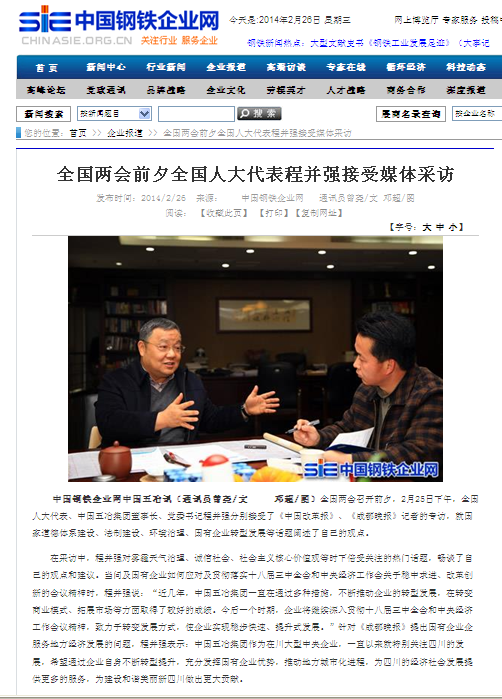 中國鋼鐵企業(yè)網(wǎng)報道:全國兩會前夕全國人大代表程并強(qiáng)接受媒體采訪