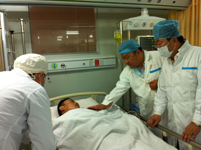 中國中冶副總裁王永光(右一),中國五冶集團董事長程并強(右二)前往醫院看望受傷員工。