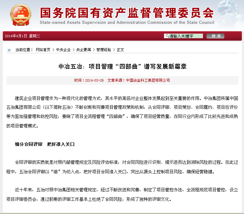 文章指出:“中國五冶集團有限公司從合同評審、項目策劃、合同履約、項目后評價等方面加強管理和防控風險,奏響了項目全流程管理‘四部曲’,確保了項目經營質量,在同行業內形成了比較先進和成熟的項目管理模式。”“2013年,項目管理‘四部曲’使中國五冶集團實現了快速健康發展,各項經濟指標再上新臺階:實現營業收入140億元,新簽合同180億元,年利潤超過6億元,在中冶集團施工企業綜合業績考評中取得了第一名的好成績,并被國務院國資委評為2013年度‘中央企業先進集體’。”