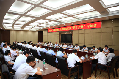 本次專題會由集團公司黨委書記、董事長程并強親自主持。各單位黨委(總支)書記匯報了黨風廉政建設“兩個責任”的開展情況。集團公司黨委副書記、紀委書記、副總經理劉偉傳達了習近平關于黨員干部作風建設的講話精神、中央關于加強保密工作的文件精神、中冶集團關于落實黨風廉政建設“兩個責任”的文件精神,同時就集團公司紀委履行黨風廉政建設監督責任情況進行了匯報。