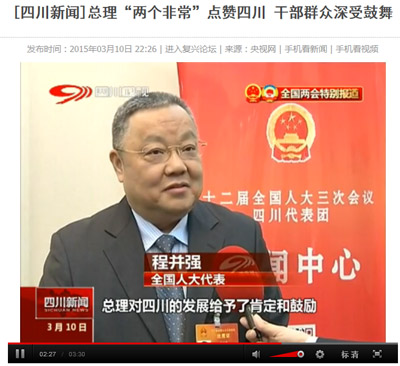 為此,四川衛視在3月10日《四川新聞》“全國兩會特別報道”中,以“總理‘兩個非常’點贊四川?干部群眾深受鼓舞”為主題,對參加十二屆全國人大三次會議四川代表團部分全國人大代表進行了采訪,全國人大代表,中國五冶集團董事長、黨委書記程并強在采訪中表示:總理對四川的發展給予了肯定和鼓勵,同時也指明了一些方向,特別是通過加大基礎設施建設、水利建設、交通建設,促進四川發展,要求四川轉型升級方面感觸很深。”