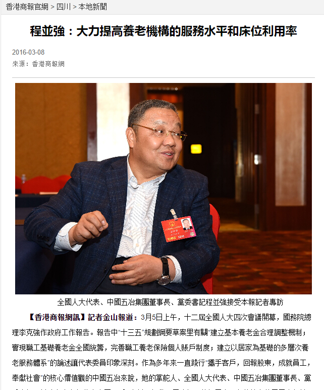 《香港商報網》記者以“大力提高養老機構的服務水平和床位利用率”為題,從李克強總理的工作報告中“十三五”規劃綱要草案里有關“建立基本養老金合理調整機制;實現職工基礎養老金全國統籌等,完善職工養老保險個人賬戶制度;建立以居家為基礎的多層次養老服務體系等”出發,就如何提高養老機構服務水平,如何提高養老床位利用率等話題,對全國人大代表,中國五冶集團董事長、黨委書記程并強進行了專訪。