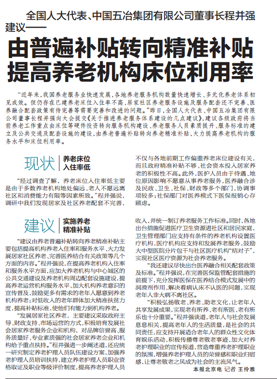 3月8日,《成都日報》和《香港商報網》分別刊文就全國人大代表,中國五冶集團董事長、黨委書記程并強向大會提交的《關于推進養老服務體系建設的幾點建議》進行了詳細的采訪報道。