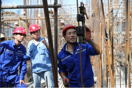 新華之星B區核心筒正在現場檢查鋼筋焊接的工作人員