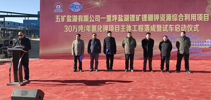 當日,由中國五冶集團有限公司承建的五礦鹽湖有限公司一里坪鹽湖鋰礦鋰硼鉀資源綜合利用項目(以下簡稱“一里坪鹽湖項目”)30萬噸/年氯化鉀項目主體工程落成暨試車啟動儀式在此舉行,標志著一里坪鹽湖項目取得了重大階段性勝利。五礦鹽湖有限公司總經理李增榮,副總經理張大義、支雪斌,中國五冶集團副總經理程先云,以及設計、監理單位相關負責人,中國五冶集團成都機電公司相關人員等出席儀式,儀式由五礦鹽湖有限公司副總經理侯昭飛主持。