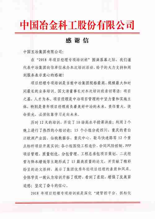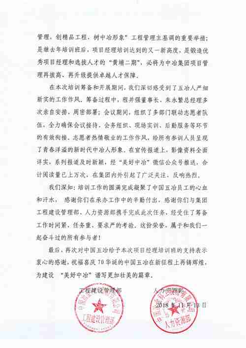 11月13日,中國冶金科工股份有限公司工程建設管理部、人力資源部向中國五冶發來感謝信,對公司在承辦中冶集團2018年項目經理專項培訓活動過程中展現的嚴細新實的工作作風表示肯定。