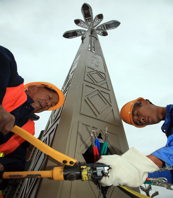5月30日,中國五冶集團(tuán)路橋公司內(nèi)江漢安大道改建工程完成路面鋪油節(jié)點(diǎn)。圖為施工人員正在安裝路燈。???????? ?(鄧超攝)
