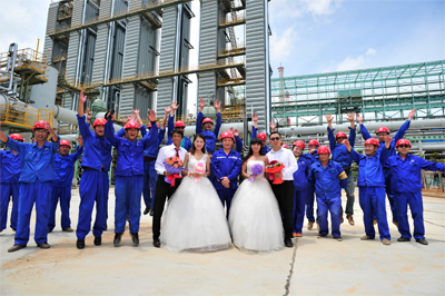 這是五冶集團湛鋼工地上的首屆集體婚禮,也是公司強化企業文化建設的具體措施之一。希望能為身處異鄉的青年員工在一定程度上排解生活的后顧之憂,讓在湛鋼工地工作的異地青年也有家的感覺,讓更多的人分享他們新婚的喜慶,見證新人們對愛的承諾。這也只是奮斗在湛鋼工地上千千萬員工的縮影,他們兢兢業業,為大家舍小家,我們為有這樣奉獻精神的員工點贊喝彩!(費虎/文?王晨輝/圖)